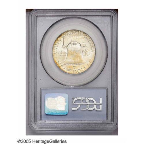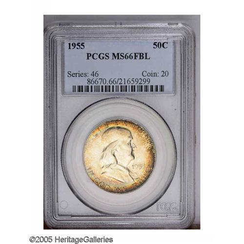 <B>1955<50C> MS66 Full Bell Lines PCGS.</B></I> Moderate amber-russet iridescence adorns the surfaces of this delightful Gem specimen.<BR><I>From the T & T Martin Registry Set of Franklin Halves.</B></I>