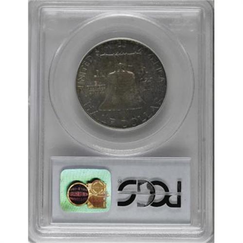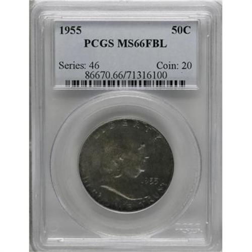 <B>1955 50C MS66 Full Bell Lines PCGS.</B></I> A richly toned Gem featuring Full Bell Lines. Each side shows deep blue-green and gold mottled toning over lustrous surfaces. PCGS has only certified one example finer than this one, and NGC has graded a mere two pieces higher (7/07). An exceptional coin for the Franklin half dollar devotee. <BR><BR><b>Shipping:</b> Coins & Currency (<a target="_blank" href="http://www.heritageauctions.com/common/shipping.php">view shipping information</a>)