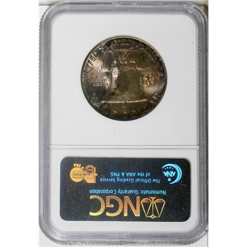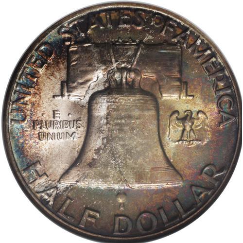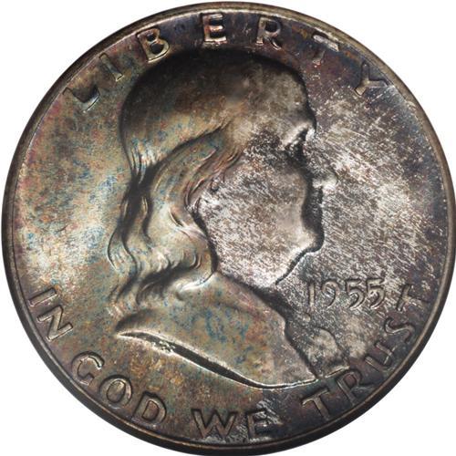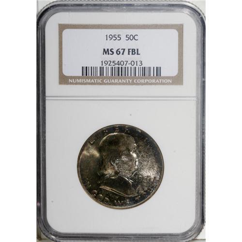 <B>1955 50C MS67 Full Bell Lines NGC.</B></I> Mottled but delightful toning in hues of gray, gold, green, yellow, and ice-blue covers both sides of this beautiful piece, almost undoubtedly the result of longtime mint-set residence. While about one-third of Mint State examples have full bell lines, few coins ever approach the immaculate state of preservation of the present piece: NGC has certified two coins in this grade, with one more at PCGS (1/07).<BR><BR><b>Shipping:</b> Coins & Currency (<a target="_blank" href="http://www.heritageauctions.com/common/shipping.php">view shipping information</a>)