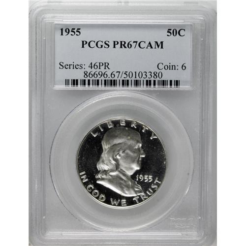 <B>1955 50C PR67 Cameo PCGS.</B></I> A pretty, delicately frosted piece that possesses moderately reflective fields. The right obverse rim has a few small flecks of milky olive patina.<BR><BR><b>Shipping:</b> Coin/Currency (<a target="_blank" href="http://www.heritageauctions.com/common/shipping.php">view shipping information</a>)