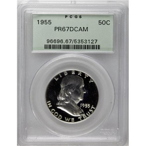 <B>1955 50C PR67 Deep Cameo PCGS.</B></I> A boldly struck piece that has strong contrast and exceptional mirrors. A few small spots of deep violet patina are located in the field below the TY of LIBERTY (strong magnification is required). While the 1955 is more often available with strong contrast than earlier issues, it proves elusive when compared to the issues of the early 1960s. Population: 31 in 67 Deep Cameo, 28 finer (3/07).<BR><BR><b>Shipping:</b> Coin/Currency (<a target="_blank" href="http://www.heritageauctions.com/common/shipping.php">view shipping information</a>)