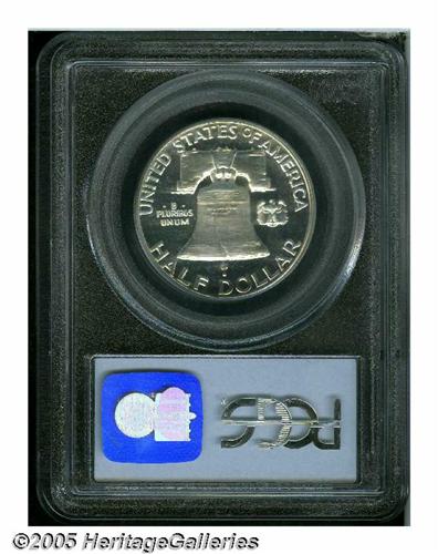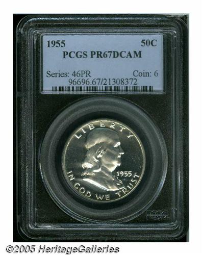 <B>1955<50C> PR67 Deep Cameo PCGS.</B></I> This is one of the finest proof 1955 Franklins that we have ever examined. With its fully brilliant appearance and wonderful aesthetic appeal, we would not be surprised to learn that this Superb Gem brought an extremely strong price. Population: 33 in 67 Deep Cameo, 13 finer (5/05).