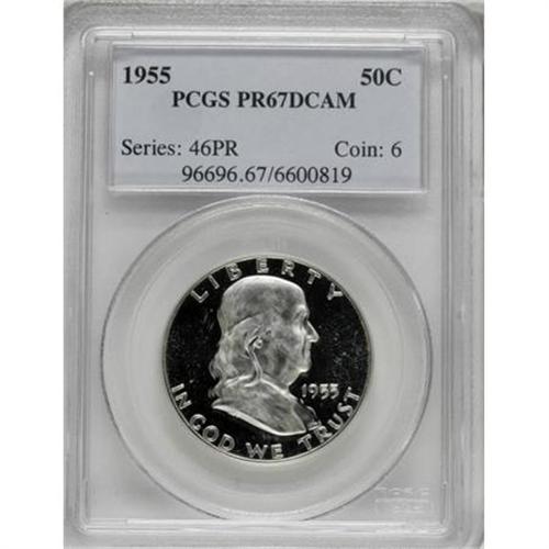 <B>1955 50C PR67 Deep Cameo PCGS.</B></I> Very few examples of this proof Franklin half issue have been certified with Deep Cameo surfaces, by either of the major services. This specimen is well struck and displays impressive white-on-black contrast on both sides. Population: 37 in 67 Deep Cameo, 14 finer (11/07). <BR><BR><b>Shipping:</b> Coins & Currency (<a target="_blank" href="http://www.heritageauctions.com/common/shipping.php">view shipping information</a>)