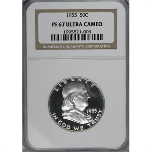 <B>1955 50C PR67 Ultra Cameo NGC.</B></I> Sharply struck with no distractions of consequence. Deeply reflective with bold black-and-white contrast, an amazing Superb Gem. Census: 32 in 67 Ultra Cameo, 30 finer (10/07).<BR><BR><b>Shipping:</b> Coins & Currency (<a target="_blank" href="http://www.heritageauctions.com/common/shipping.php">view shipping information</a>)