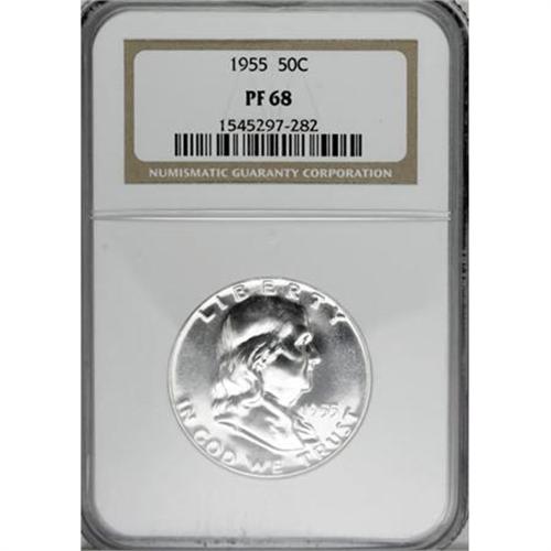 <B>1955 50C PR68 NGC.</B></I> NGC Census: (891/12). PCGS Population (166/3). Mintage: 378,200. Numismedia Wsl. Price for NGC/PCGS coin in PR68: $175. (#6696)<BR><BR><B>Coin Engraver:</B> John R. Sinnock<BR><BR><b>Shipping:</b> Coins & Currency (<a target="_blank" href="http://www.heritageauctions.com/common/shipping.php">view shipping information</a>)