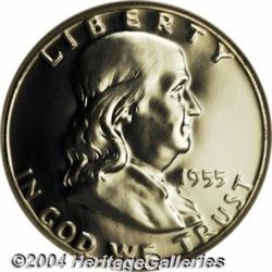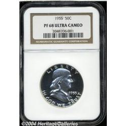 <B>1955<50C> PR68 Ultra Cameo NGC.</B></I> A pronounced contrast exists between the frosty design elements and the deeply mirrored fields. Exquisite detail throughout, with virtually untoned and blemish free surfaces. Population: 20 in 68, 1 finer (6/04). <BR><BR><B>Important notice:</B> Heritage usually auctions material at the rate of 200-250 lots per hour. On some occasions eBay Live bid software or the Internet may not be able to keep up with the pace of the auction. We recommend placing a realistic absentee bid now as insurance to avoid disappointment. Occasionally the auctioneer may eliminate or reject an eBay Live bid, and the auctioneer may also reopen a lot after the close of the eBay live bidding (usually because we missed an audience bid), and may reject your bid even if it shows you as the winning bidder. By bidding via eBay Live, you agree that Heritage may award the lot to another bidder at its sole discretion under the circumstances described above or any other reasonable circumstances. Since eBay bids are not shown to us until we open the lot on the floor, we treat those bids just like floor bids. In most cases the floor responds before the eBay bid is presented to us, due to Internet lag time, so for consistency we have made it a policy that floor bids are always considered first over tie eBay live bids. Also please note that all Heritage lots purchased through eBay Live carry a 20% Buyer's Premium. Please make sure you read the Terms and Conditions before you bid. </span></font></tr></table></td></tr></table>