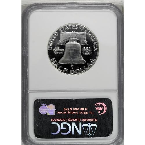 <B>1955<50C> PR69 Cameo NGC.</B></I> A gorgeous, fully brilliant Franklin half. The white-on-black contrast is particularly impressive on the reverse. Most proof halves from the fifties lack frost on the devices; the present piece provides an exception. Census: 4 in 69 Cameo, 0 finer (5/06).