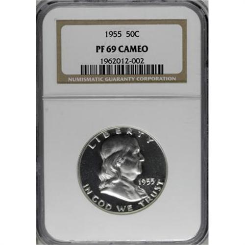<B>1955 50C PR69 Cameo NGC.</B></I> A gorgeous, fully brilliant proof Franklin half. Fully struck and virtually pristine. The white-on-black contrast is particularly impressive on the reverse. Most proof halves from the fifties lack frost on the devices; the present piece provides an exception. Census: 4 in 69 Cameo, 0 finer (6/07). <BR><BR><b>Shipping:</b> Coins & Currency (<a target="_blank" href="http://www.heritageauctions.com/common/shipping.php">view shipping information</a>\)