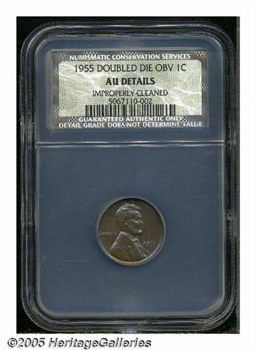 <B>1955/55<1C> Doubled Die AU Details, Improperly Cleaned, NCS.</B></I> Powder-blue and olive hues embrace this boldly defined key date Cent. The reverse displays more typical tan-brown color. The strongest doubled die in the series.