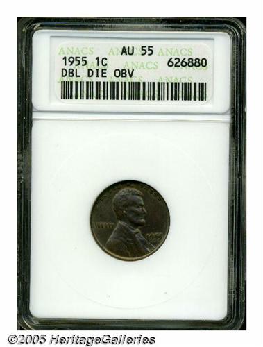 <B>1955/55<1C> Doubled Die AU55 ANACS.</B></I> Glossy, chocolate brown, with hints of original mint red surrounding most of the lettering and devices. One or two insignificant marks appear on either side, all of which are consistent with the grade. This obviously doubled obverse ranks as one of the most intriguing and popular of all U.S. die varieties!