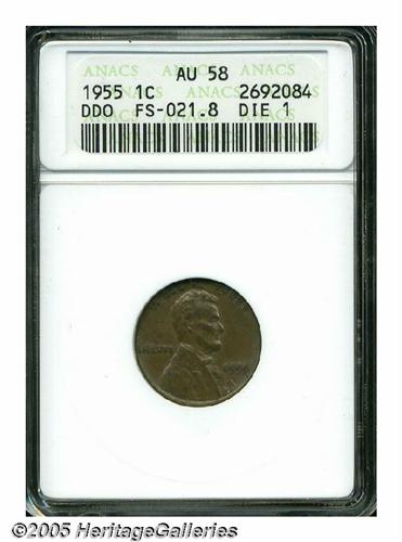 <B>1955/55<1C> Doubled Die AU58 ANACS.</B></I> FS-021.8. Die #1. A chocolate-brown representative of this spectacular variety. A few small spots and an inconspicuous mark on the forehead are noted.