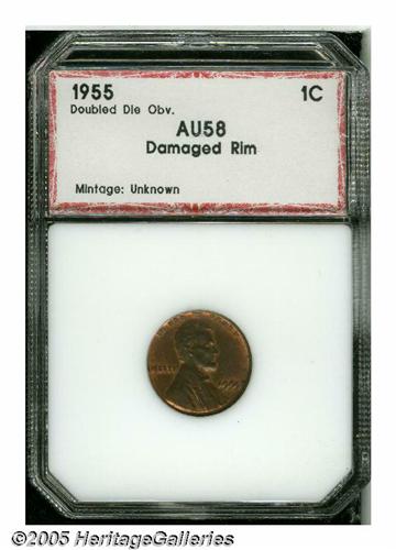 <B>1955/55<1C> Doubled Die AU58 Damaged Rim PCI (MS60 Rim Damage).</B></I> This doubled die reveals considerable mint red interspersed with areas of tan color. The design elements are adequately struck. A few minute contact marks are noted on Lincoln's forehead, cheek, and shoulder. The main impairment resulting in a Red Holder PCI slab is a large rim bruise at 6 o'clock on the reverse.