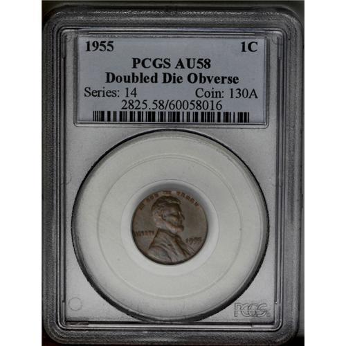 <B>1955/55<1C> Doubled Die AU58 PCGS.</B></I> FS-021.8. An example of the quintessential doubled die that has glossy brown surfaces with underlying violet-red. Some faint surface ticks are noted, but are all exceedingly minor.