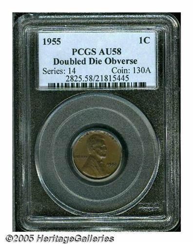 <B>1955/55<1C> Doubled Die AU58 PCGS.</B></I> FS-021.8. Olive and medium brown hues embrace the obverse, while the reverse has deeper golden-brown toning bounded by light tan color. A bold and lightly marked representative of this important key date.