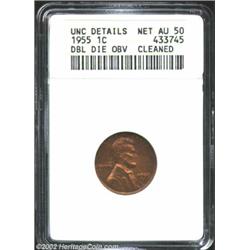 1955/55 1C Doubled Die--Cleaned--ANACS. Unc Details, Net AU50. Recolored and since retoned, with a faintly porous texture to the exposed fields. A boldly detailed representative of this uniquely spectacular doubled die variety. Important notice: We expect to be auctioning lots at the rate of 200-250 per hour. Sometimes eBay Premier live bid software cannot keep up with that pace, so we strongly recommend that you place a realistic proxy bid now as insurance to avoid disappointment. Also please note that all Heritage/CAA lots purchased through eBay Premier carry a 20% Buyer's Premium. Please make sure you read the Terms and Conditions.