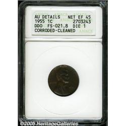 <B>1955/55 1C Doubled Die--Corroded, Cleaned--ANACS. AU Details, Net XF45.</B></I> FS-021.8. Die #1. A bold representative of this desirable series key; the most famous doubled die variety in numismatics. The surfaces are uniformly micro-pitted, and the streaky magenta and lavender color is not original.