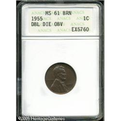 <B>1955/55 1C Doubled Die MS61 Brown ANACS.</B></I> The predominantly glossy brown surfaces reveal flickers of sky-blue and orange iridescence in select areas. A few minute marks are noted on the obverse. An always popular variety.<BR><I>From The Lonnie Gray Collection of Error Coins.</B></I> Lot:5569