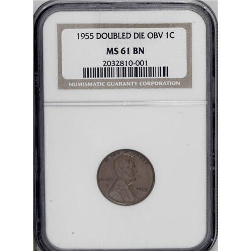 <B>1955/55<1C> Doubled Die Obverse MS61 Brown NGC.</B></I> FS-021.8. A bold chocolate-brown representative of this desirable mint error. Each side has a small and unobtrusive spot in addition to scattered abrasions.