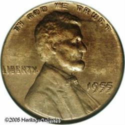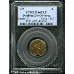 <B>1955/55 1C Doubled Die MS62 Red and Brown PCGS.</B></I> Glimpses of cherry-red color on the reverse, with some browning on the obverse. The few small marks are concentrated near the center of the obverse. A fine looking and, in this grade, legitimately scarce example of this popular modern error. Lot:5570
