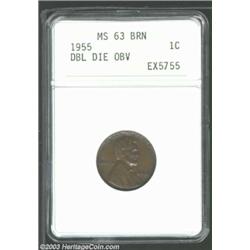 1955/55 1C Doubled Die MS63 Brown ANACS. Richly toned, the predominantly glossy brown surfaces revea