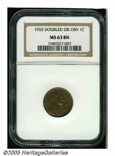 <B>1955/55<1C> Doubled Die MS63 Brown NGC.</B></I> The smooth chocolate-brown surfaces occasionally cede to rose or mahogany hues. A boldly struck example of this dramatic DDO error. A couple of minor marks on the left reverse, the less important side, prevent an even finer grade.<BR><I>Ex: Brooks Collection (Bowers and Merena, 6/89), lot 2079, which brought $825.</B></I>