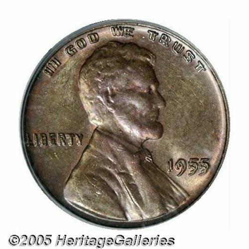 <B>1955/55<1C> Doubled Die MS63 Brown PCGS.</B></I> Medium olive-tan and crimson patina visits this well struck example. The C of CENT exhibits a noticeable carbon spot. A key date, and the most famous of all doubled die varieties.<BR><I>From The Dr. Theodore Almquist Collection.</B></I>