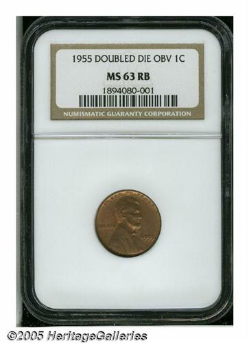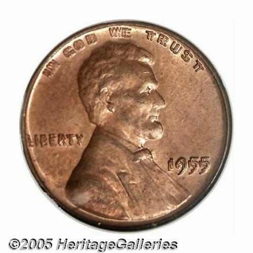 <B>1955/55<1C> Doubled Die MS63 Red and Brown NGC.</B></I> A nicely struck example of this ever-popular variety. The slightly muted surfaces are mainly deep cherry red, with occasional hints of tan patina. Several marks are evident on Lincoln's head that limit the grade.