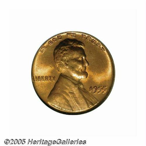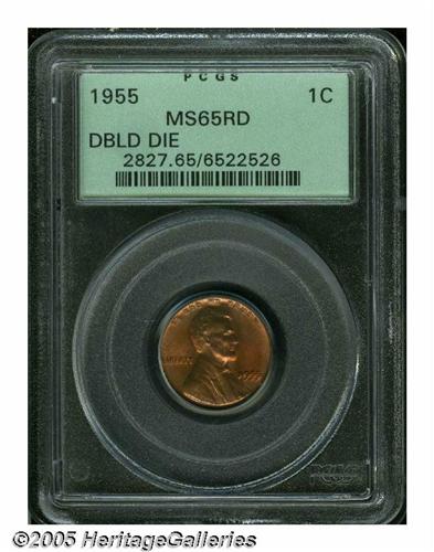 <B>1955/55<1C> Doubled Die MS65 Red PCGS.</B></I> The 1955 Doubled Die is truly one of the great mint errors of the Twentieth century. This popularity came about not by singular promotion but by the sheer magnitude of the error. Even to the naked eye the dramatic doubling of the date, motto and LIBERTY is clear. With the aid of a loupe, the error is brought to even fuller life. To acquire an example of this coin is usually one of the highlights of any Lincoln cent collector. To obtain an example in Mint State is quite a challenge. Here is one of the very finest examples to survive, not only is this a Gem specimen with excellent surfaces throughout, but the "red" color has somehow survived as well. The color ranges from bright red to the slightest hint brick red with yellow-gold hints. Faint traces of carbon can be seen on the lower obverse. Most of this issue ended up in circulation, and very few today have more than a trace of the original red imparted by the Mint. This coin has it all, rarity, condition, popularity and is tied with a small select group as one of the finest to survive. Don't miss out if you have been waiting for just the right coin to turn up to represent this key coin to your Lincoln cent collection. Population: 18 in 65, 0 finer (6/05).<BR><I>From The William Bickel Collection, Part One.</B></I>