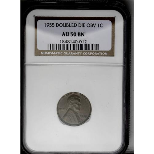<B>1955/55<1C> Doubled Die Obverse AU50 NGC.</B></I> FS-021.8. Light wear is seen on the cheekbone and jaw, but this medium brown key date cent is sharply struck. The only noticeable marks are found above the right wheat ear stem, distant from the focal points.