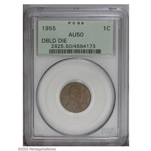 <B>1955/55<1C> Doubled Die Obverse AU50 PCGS.</B></I> FS-021.8. Brown with reddish tints and light amounts of fiction on the device detail. One wispy abrasion is noted on the back running through TED in UNITED. Housed in an older PCGS holder.