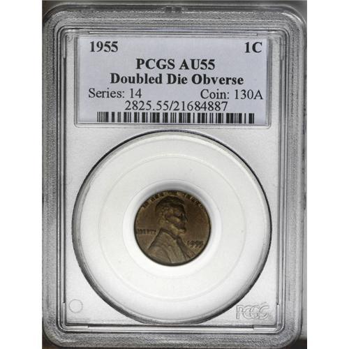 <B>1955/55<1C> Doubled Die Obverse AU55 PCGS.</B></I> FS-021.8. The remarkably broad doubling on this famous variety is perhaps the most dramatic of all time, at least for an American regular issue coin. Lightly worn with a few small marks. A pleasing representative for the grade.