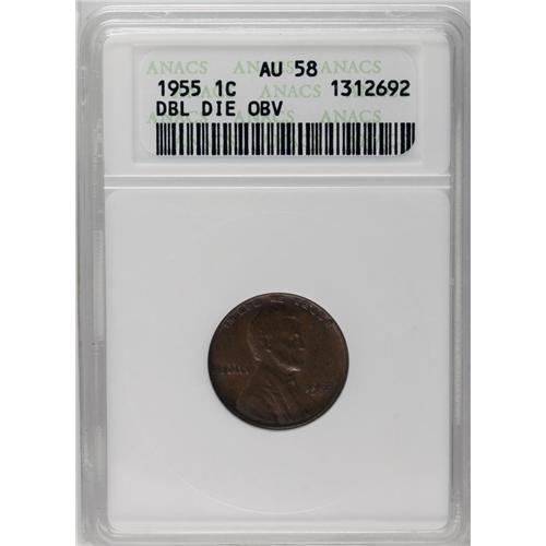 <B>1955/55<1C> Doubled Die Obverse AU58 ANACS.</B></I> FS-021.8. A partly lustrous chocolate-brown example with trivial contact and a whisper of rub on the cheekbone and jaw. This famous doubled die variety is always spectacular to observe.<BR><I>From The Empire Tree Collection, Part Two.</B></I>