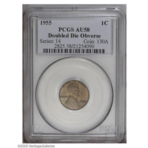 <B>1955/55<1C> Doubled Die Obverse AU58 PCGS.</B></I> FS-021.8. An incredible United States Mint mishap, this example is attractive for the grade with glossy brown surfaces that are not interrupted by deep abrasions. A great example for the cent enthusiast on a limited budget.