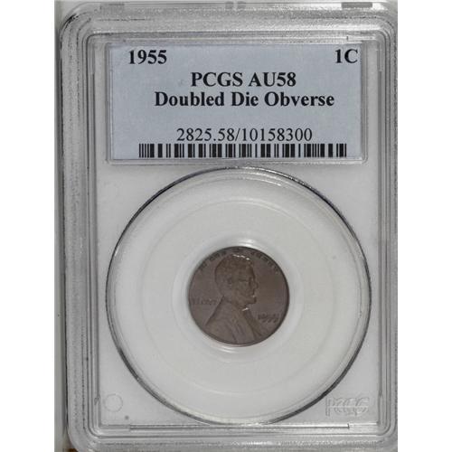 <B>1955/55<1C> Doubled Die Obverse AU58 PCGS.</B></I> FS-021.8. Shortly after these coins were discovered and promoted, they were widely known as "Shift Cents," such was the general level of knowledge of what a doubled die was from 1955 to 1965. This is a glossy brown example with significant portions of mint luster remaining. The brown surfaces have a few marks from its short time in circulation, but the only ones that are worthy of comment are located at the top of Lincoln's head.