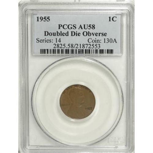 <B>1955/55 1C Doubled Die Obverse AU58 PCGS.</B></I> FS-101. Sharply struck with dark chocolate surfaces and nearly full satiny luster. The most visually arresting of the various Lincoln cent doubled die varieties, since the doubling is visible to the unaided eye.<BR><BR><B>Coin Engraver:</B> Victor D. Brenner<BR><BR><b>Shipping:</b> Coins & Currency (<a target="_blank" href="http://www.heritageauctions.com/common/shipping.php">view shipping information</a>)