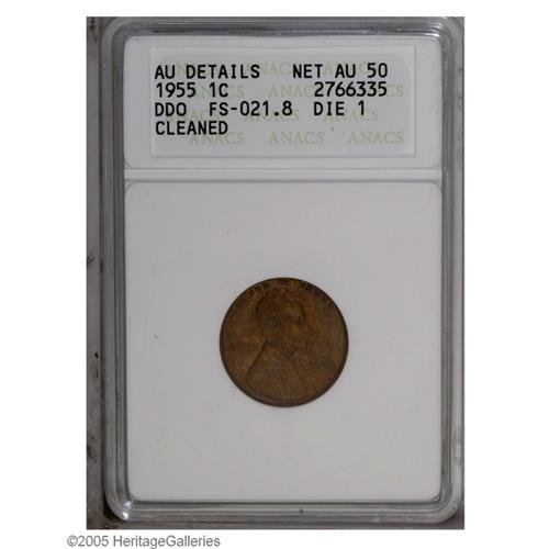 1955/55 1C Doubled Die Obverse--Cleaned--ANACS. AU Det 1955/55[1C] Doubled Die Obverse--Cleaned--ANA