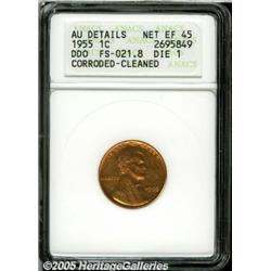 <B>1955/55 1C Doubled Die Obverse--Corroded, Cleaned--ANACS. AU Details, Net XF45.</B></I> FS-021.8, Die 1. Orange surfaces reveal light to moderate hairlines and mild porosity.