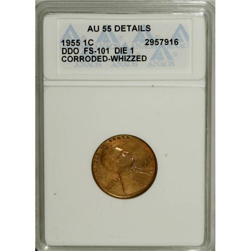 <B>1955/55 1C Doubled Die Obverse--Corroded, Whizzed--ANACS. AU55 Details.</B></I> FS-101. Die #1. This is a well struck example of the most famous Lincoln cent doubled die variety. The bright olive-gold and peach coloration is suspicious, and the surfaces have a granular texture from whizzing. Light corrosion also appears on each side of this impaired specimen.<BR><I>From The Greg Southward Collection.</B></I><BR><BR><b>Shipping:</b> Coins & Currency (<a target="_blank" href="http://www.heritageauctions.com/common/shipping.php">view shipping information</a>)