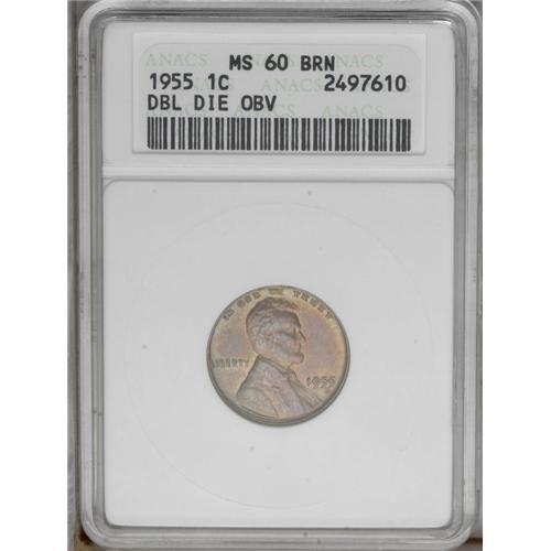 <B>1955/55<1C> Doubled Die Obverse MS60 Brown ANACS.</B></I> FS-021.8. Cherry-red, steel-blue, and gold toning enriches this shimmering and lightly abraded key date cent. The spread between images is remarkable for a 20th century issue.