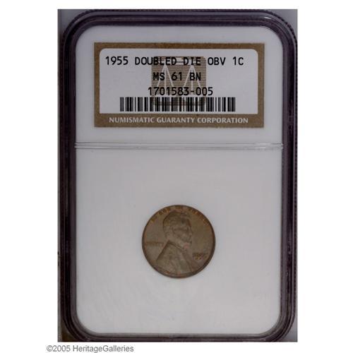 <B>1955/55<1C> Doubled Die Obverse MS61 Brown NGC.</B></I> FS-021.8. Glimpses of mint red color emerge from the recesses of the otherwise rich golden-brown patina. This sharply struck and shimmering key date Cent has a faint fingerprint fragment on the right reverse and a subdued horizontal mark beneath ONE.