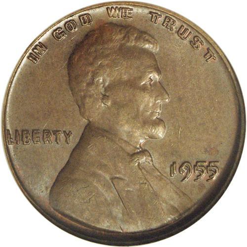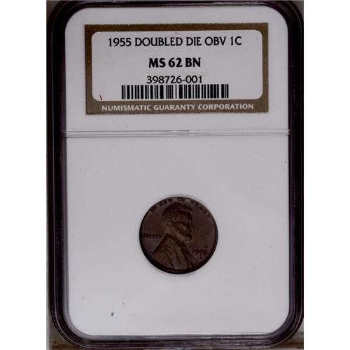 <B>1955/55<1C> Doubled Die Obverse MS62 Brown NGC.</B></I> This glossy brown popular doubled die displays subtle gold and sky-blue undertones and sharply impressed design features; all of the lines in the wheat stalks are defined, save for slight softness in those immediately right of the kernels in the right stalk. A few minor contact marks are noted on the obverse portrait, and in the field to the right of the chin.