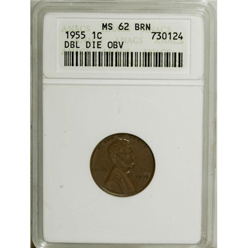 <B>1955/55 1C Doubled Die Obverse MS62 Brown ANACS.</B></I> FS-021.8. On many so-called doubled die issues from the 20th century, one almost has to use their imagination (or at least a very strong glass) to recognize the doubling. Not so with the granddaddy of them all. Here, dramatic doubling is seen over pleasing, glossy brown surfaces.<BR><BR><b>Shipping:</b> Coin/Currency (<a target="_blank" href="http://www.heritageauctions.com/common/shipping.php">view shipping information</a>)