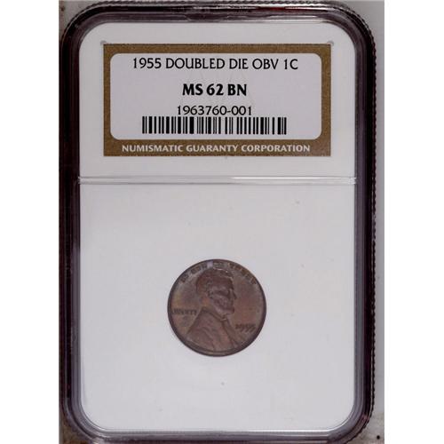 1955/55 1C Doubled Die Obverse MS62 Brown NGC. Attract 1955/55[1C] Doubled Die Obverse MS62 Brown NG