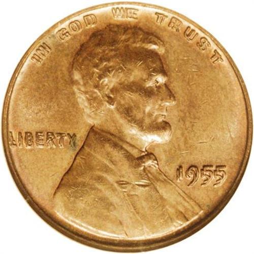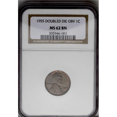 <B>1955/55<1C> Doubled Die Obverse MS62 Brown NGC.</B></I> FS-21.8. A mostly chocolate-brown key date cent with a few trivial ticks on the obverse. Close examination shows a few faint areas of original red around the obverse lettering and devices, and powder-blue accents are noted on the reverse. Perhaps the most spectacular doubled die variety in American numismatics.