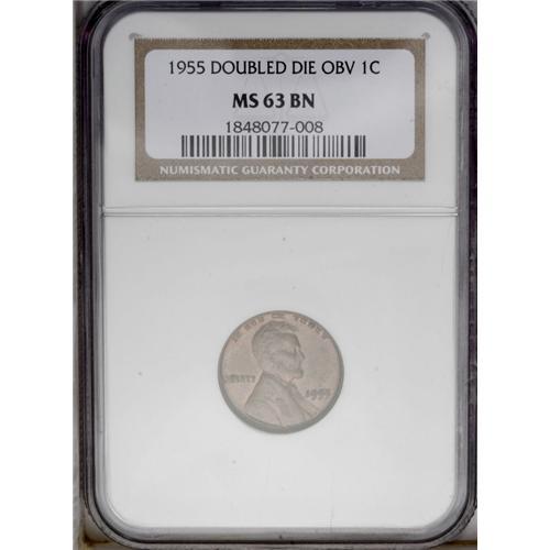 <B>1955/55<1C> Doubled Die Obverse MS63 Brown NGC.</B></I> The obverse doubled die features are very clear, as expected on a Mint State example of this highly popular variety, one of the most well-known of all time. Lincoln's hair detail is slightly weak, but there are almost no other detracting elements worthy of mention, least of all any noticeable marks or blemishes.