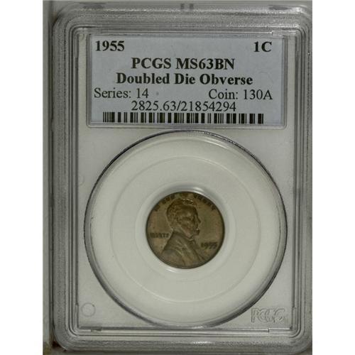 <B>1955/55 1C Doubled Die Obverse MS63 Brown PCGS.</B></I> FS-021.8. Well struck with bright satiny luster, this Select Mint State cent reveals rich tobacco-brown and bright-green coloration. The famously broad doubling on the obverse lettering, including the date, is easily seen without magnification. A few tiny marks and carbon specks limit the grade.<BR><BR><b>Shipping:</b> Coin/Currency (<a target="_blank" href="http://www.heritageauctions.com/common/shipping.php">view shipping information</a>)