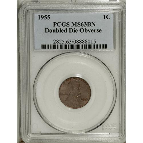 <B>1955/55<1C> Doubled Die Obverse MS63 Brown PCGS.</B></I> Traces of muted mint luster still cling to the protected areas of the obverse, including the date and motto, while the remainder of both sides is a glossy olive-brown. This strictly Mint State coin shows a somewhat soft strike on Lincoln's coat and a couple of ticks on the face that define the grade, but much eye appeal remains.