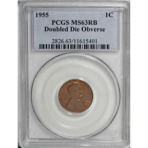 <B>1955/55 1C Doubled Die Obverse MS63 Red and Brown PCGS.</B></I> The famous doubled die of 1955 is possibly the most important doubled die variety listed in the Guide Book. This piece has splendid surfaces with full satin luster. Both sides have considerable reddish-orange mint color that is accompanied by pale blue and brown toning. A single small spot can be seen on the reverse.<BR><BR><b>Shipping:</b> Coins & Currency (<a target="_blank" href="http://www.heritageauctions.com/common/shipping.php">view shipping information</a>)