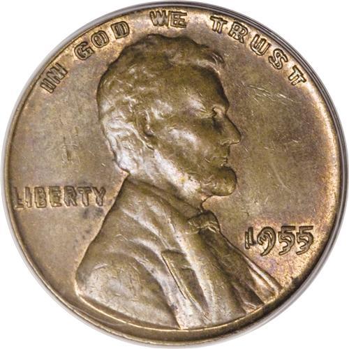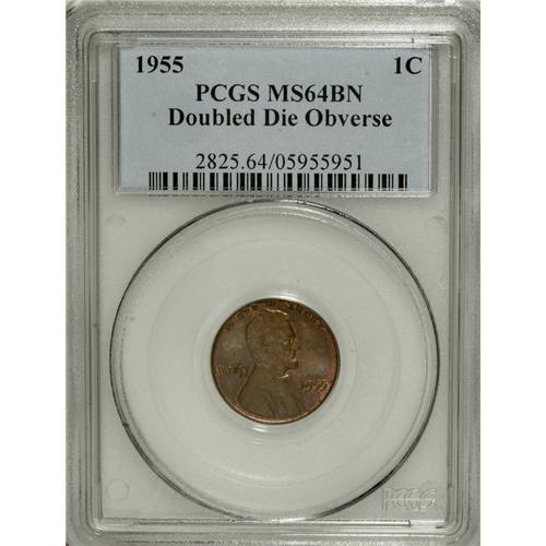 <B>1955/55 1C Doubled Die Obverse MS64 Brown PCGS.</B></I> According to Lange's <I>The Complete Guide to Lincoln Cents</B></I> (2005), that these spectacular error coins exist at all is a minor miracle. They were produced during a midnight-8 a.m. shift only because the error die escaped the attention of seven persons--the hub press operator, the heat-treater, the die shop foreman, the engraver, the coining room foreman, the die-setter, and the press operator--and because they were already mixed in with nonerror cents by the time examples were discovered. Then, rather than condemn an entire night's production of 10 million cents, the newly appointed chief coiner of the Philadelphia Mint chose to let them into circulation.<BR> This piece offers glimpses of mint red clinging to the obverse periphery and protected areas on the reverse, with medium-brown coloration elsewhere. PCGS has certified only five Brown pieces finer (4/07).<BR><BR><b>Shipping:</b> Coins & Currency (<a target="_blank" href="http://www.heritageauctions.com/common/shipping.php">view shipping information</a>)