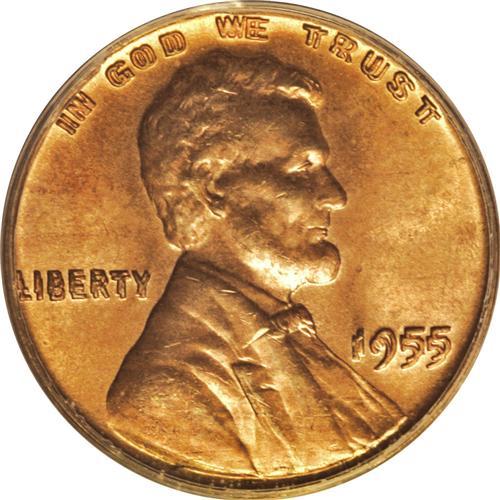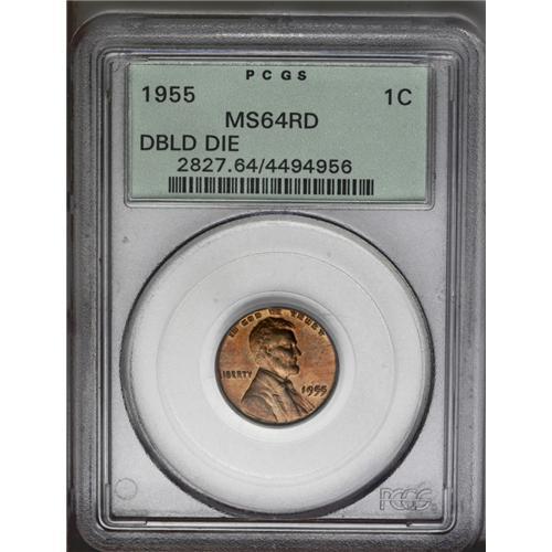 <B>1955/55<1C> Doubled Die Obverse MS64 Red PCGS.</B></I> Sunset-red luster decorates both sides of this premium quality error cent. The devices are well defined and the obverse doubling is, as always, readily evident even to the unaided eye. Although predominantly clean, a few wispy abrasions on Lincoln's jaw overrule this coin's bid for a higher grade. Because examples of this variety that combine full mint bloom and delicately preserved surfaces never fail to attract numerous bidders, we encourage serious collectors to enter respectful bids for this near-Gem. Housed in an early PCGS holder with a green insert.